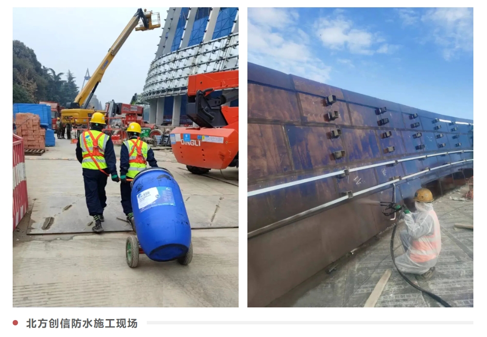 三星堆新馆的曲面幕墙的防水施工项目设计做法为2.5mm厚喷涂速凝防水涂料,,防水层施工在干挂幕墙的铝板上,,,,要求防水层具备曲面包裹好、、、、粘接优良、、抵抗变形强等特点,,,,同时作为省级重点建设项目,,对选用防水材料的使用寿命、、、、环保性、、、、耐火等级都有着严苛的要求。。。。凯时尊龙cx-SSE高分子水性喷涂速凝防水涂料不但拥有可完美包覆、、高弹抗变形、、、附着力卓越等优点,,,更有以下优势: